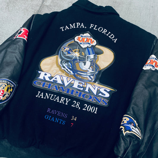 Baltimore Ravens: 2001 Super Bowl XXXV Champions Leather Sleeve Woollen Jeff Hamilton Varsity Jacket (M/L)