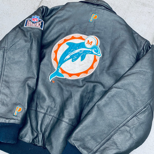 Miami Dolphins: 1990's Pro Player Blackout Leather Fullzip Bomber Jacket (L)