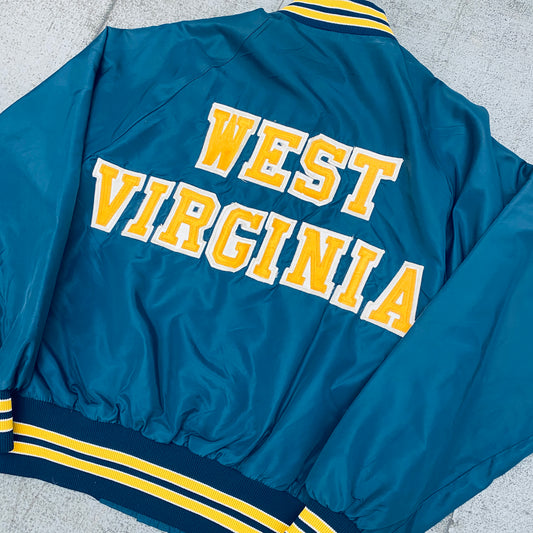 West Virginia Mountaineers: 1980's Satin Stitched Reverse Spellout Bomber Jacket (S)