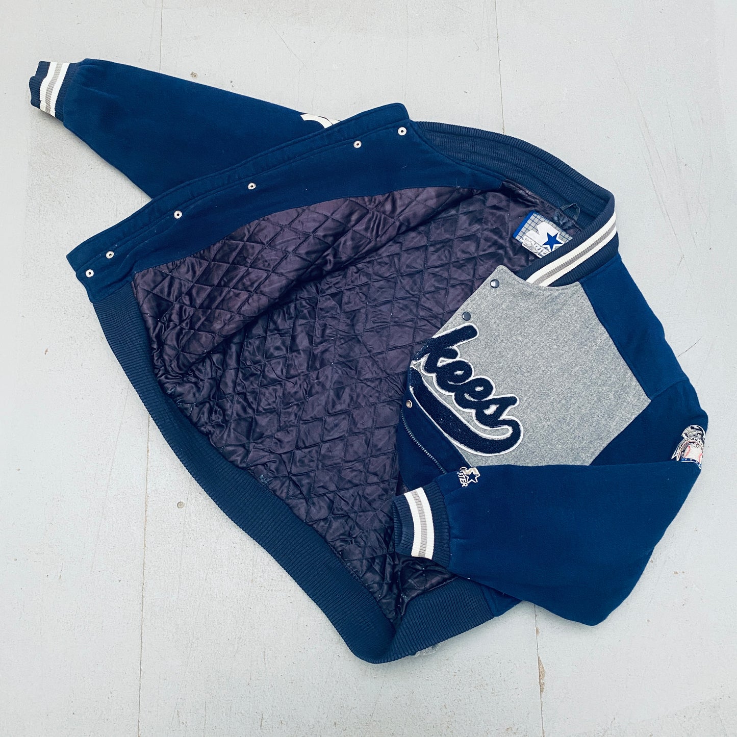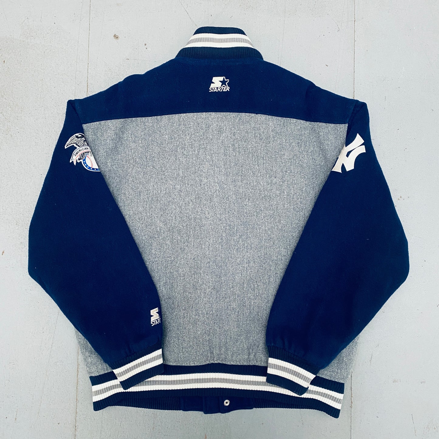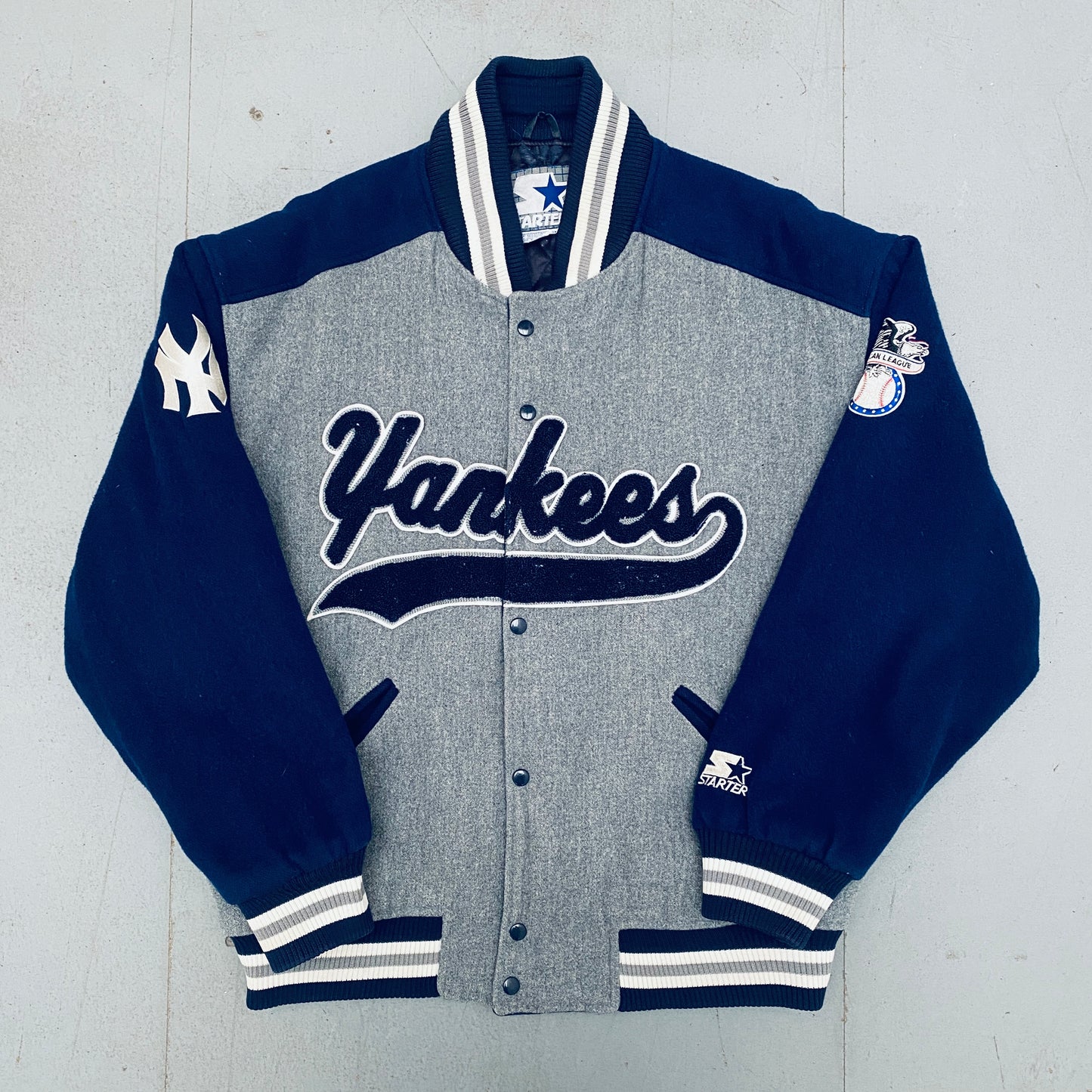 New York Yankees: 1990's Wool Stitched Script Spellout Fullzip Starter Bomber Jacket (XL)