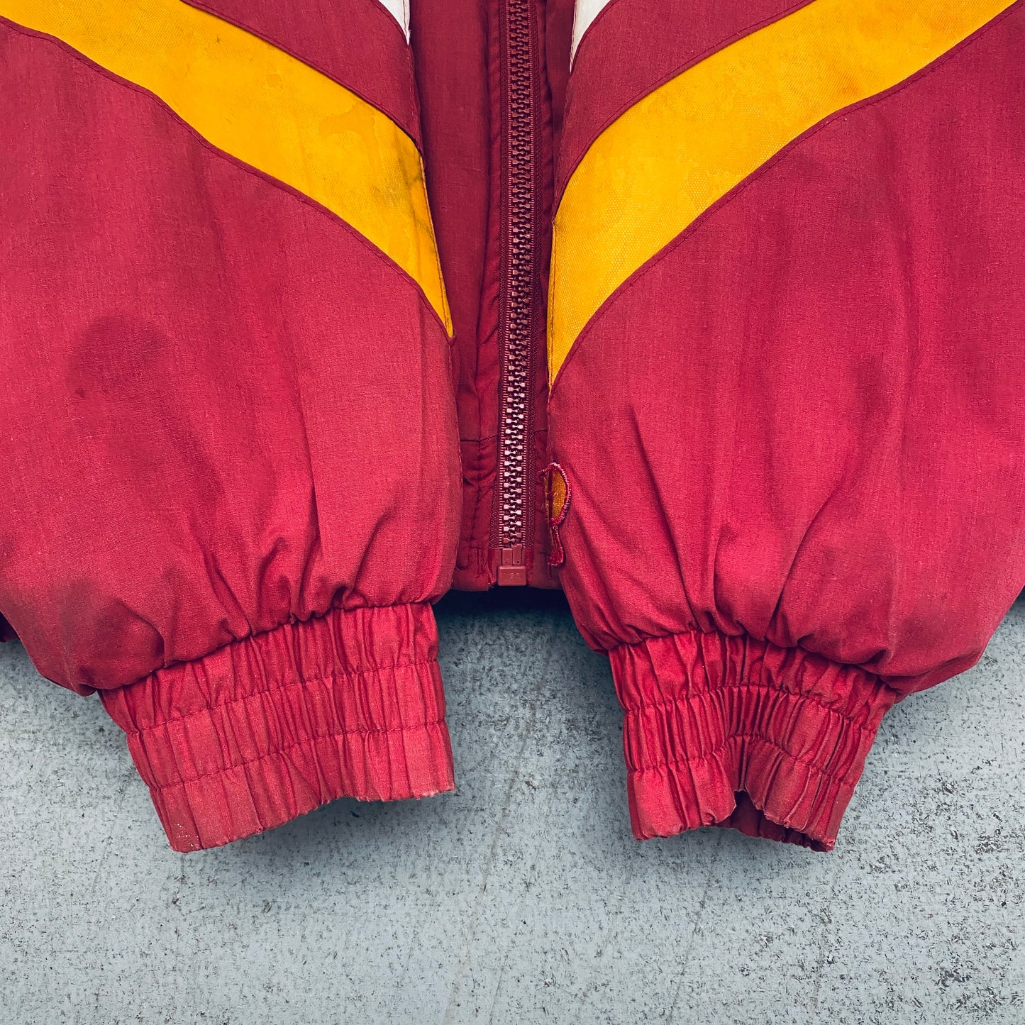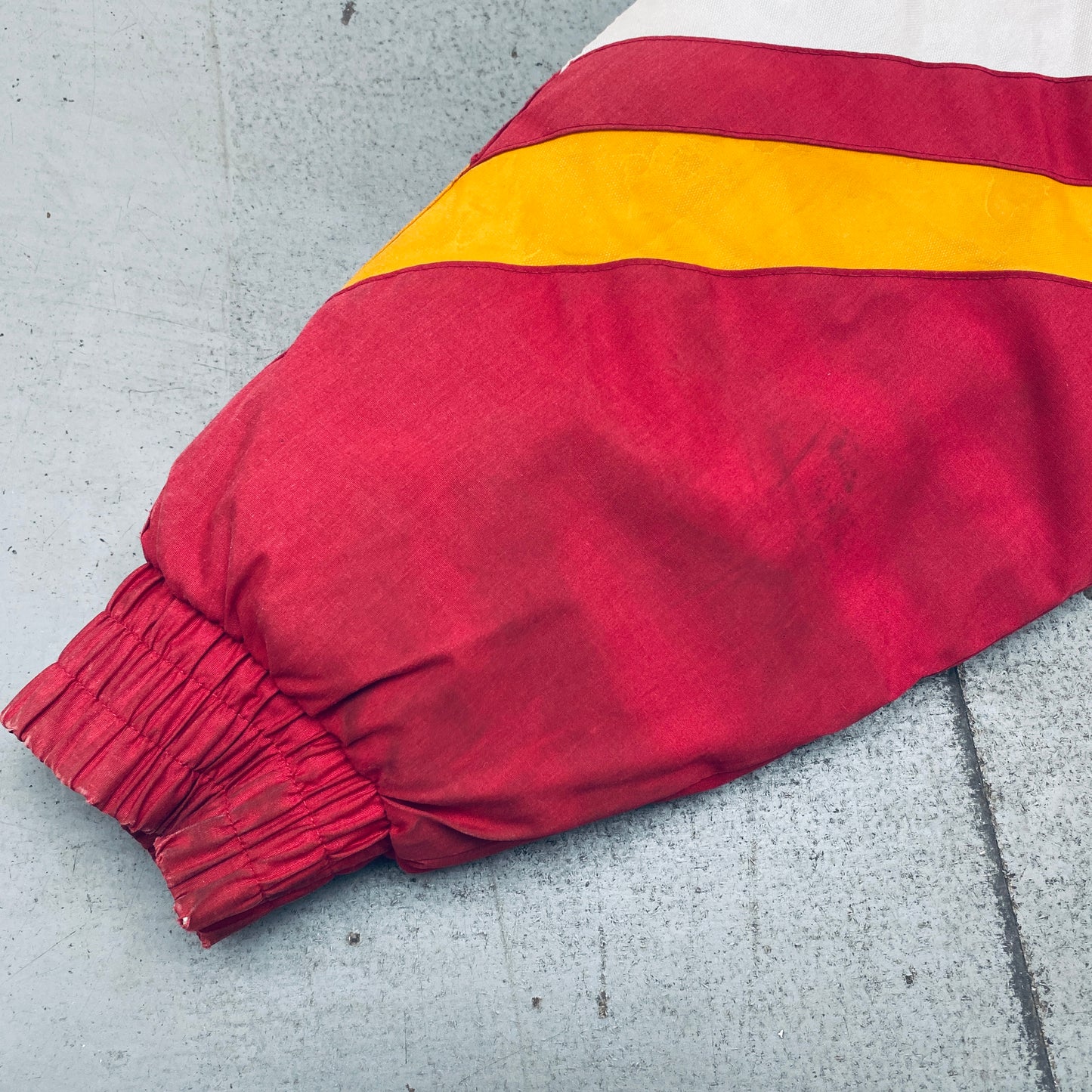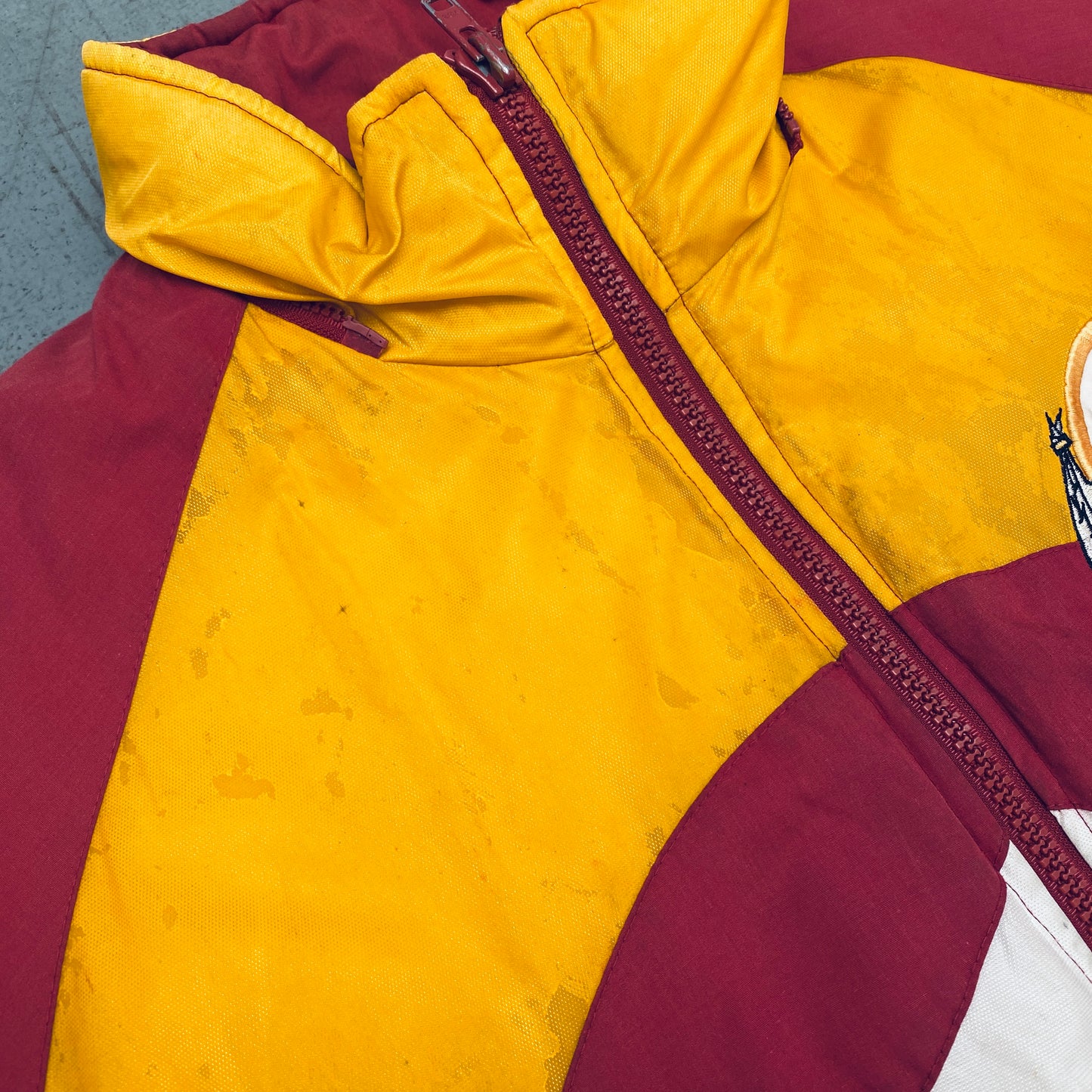 Condition: Good - marks on front, sleeve, by cuff and on back, peeling to yellow material on front, back and sleeves (see pics)